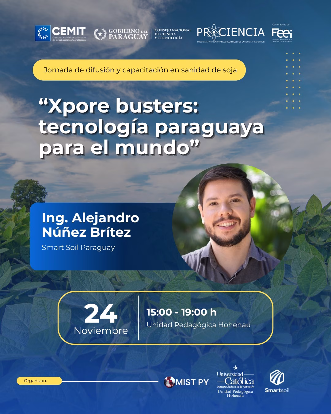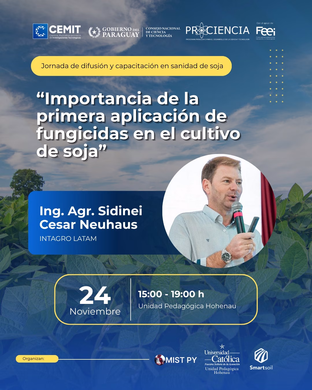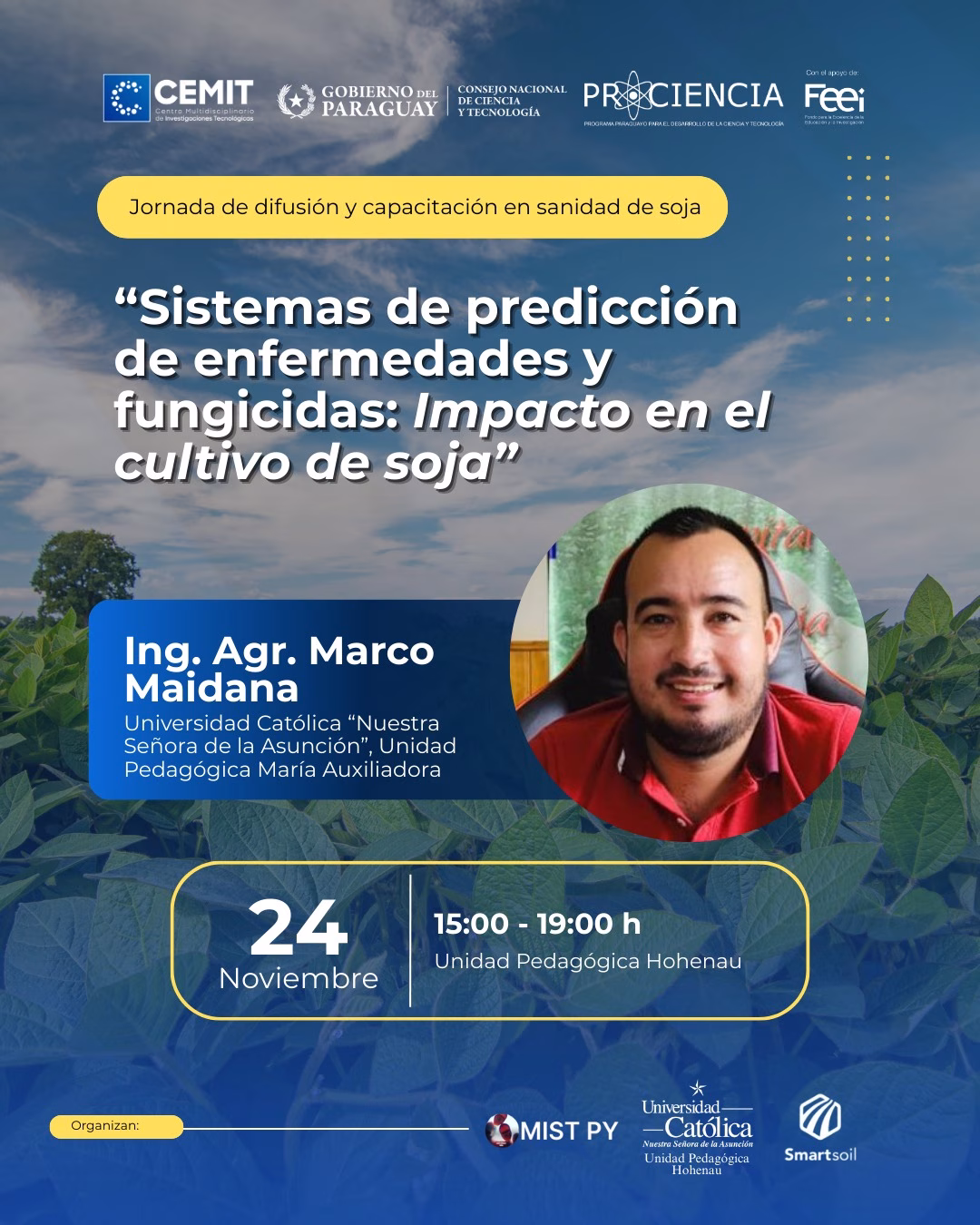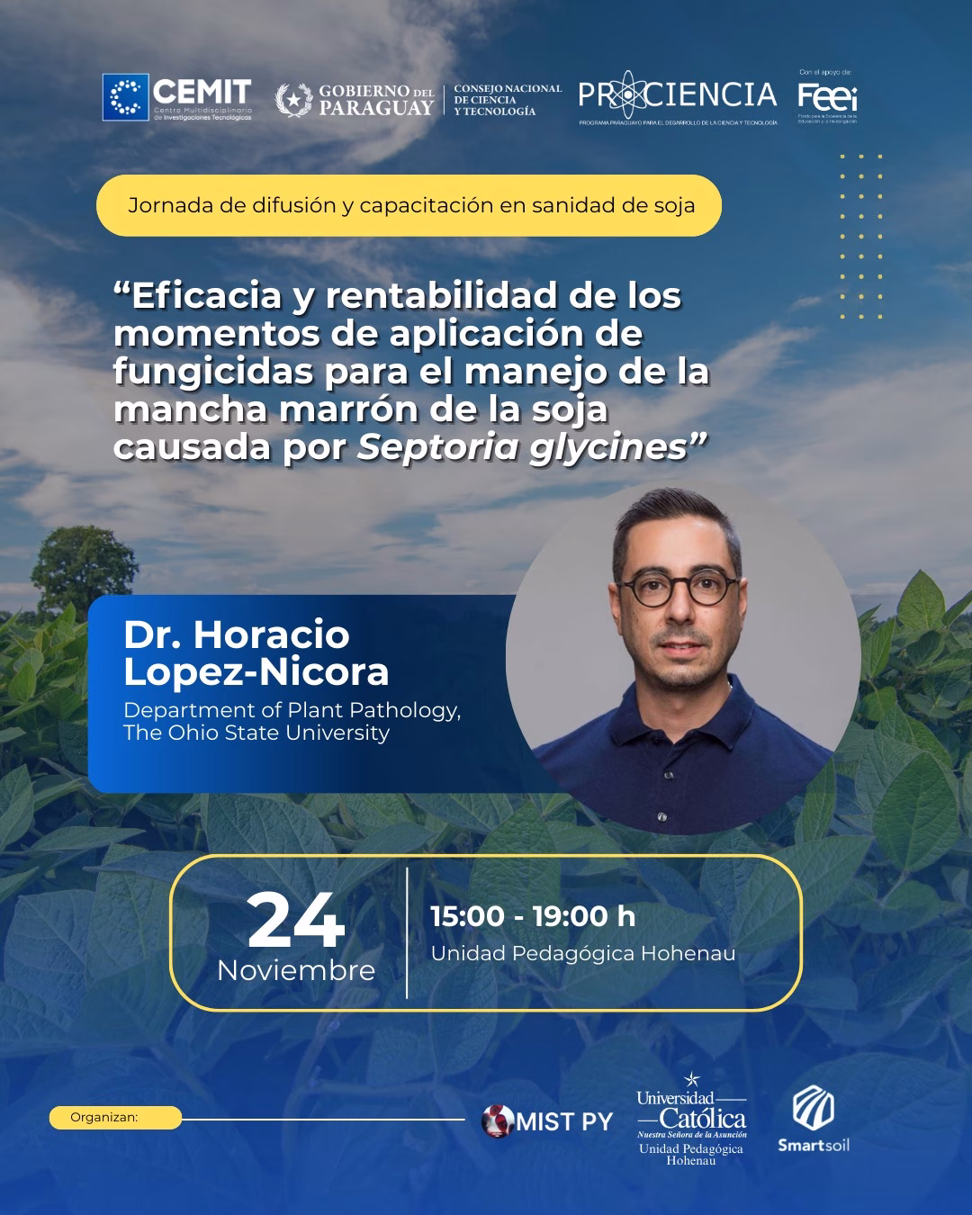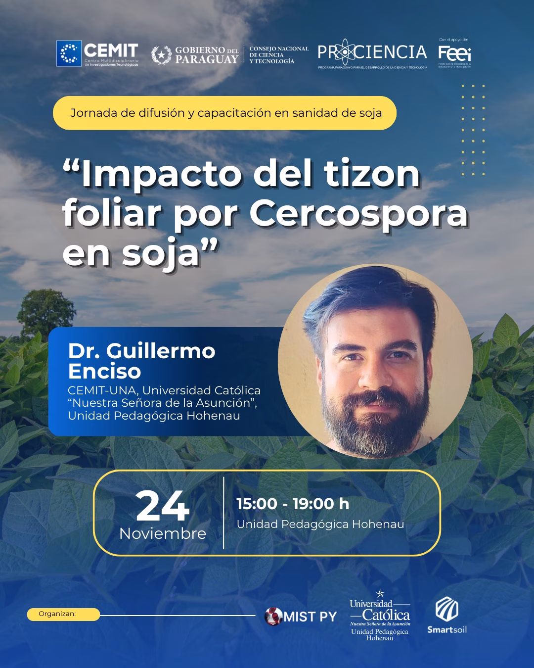 ▶Evento organizado en el marco del Proyecto PINV01-152 (Cercospora en soja), financiado por CONACYT–FEEI, y organizado por CEMIT, UPH y Smart Soil PY.